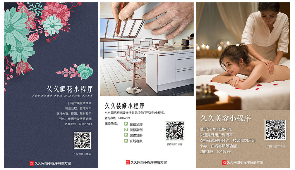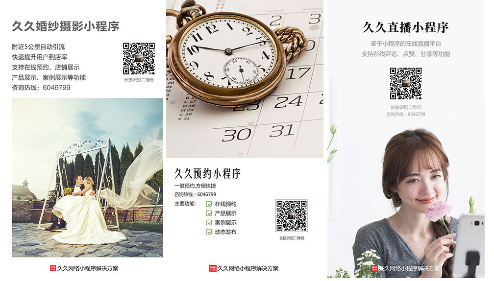 除了正常的信息内容展示功能外,预约管理、订单管理、连锁管理、分销商城等功能极大程度的满足各个商家的应用需求。配合久久网络专业、完善的售后体系,使小程序成为企业实现“互联网+”有利的帮手。